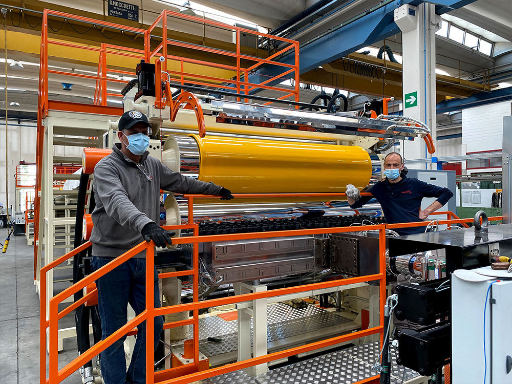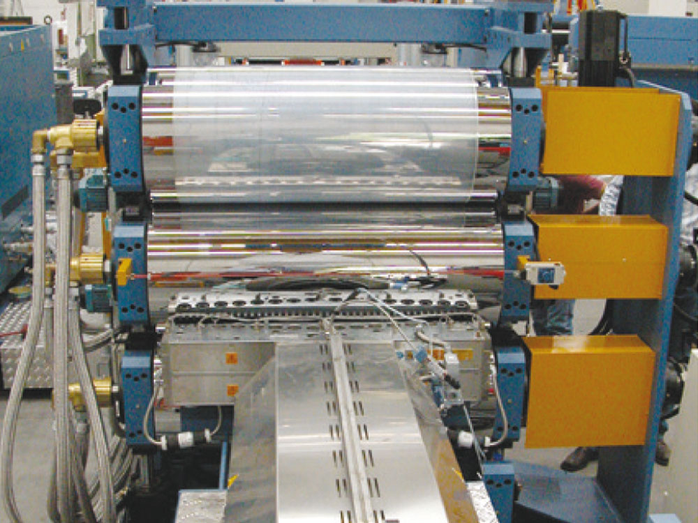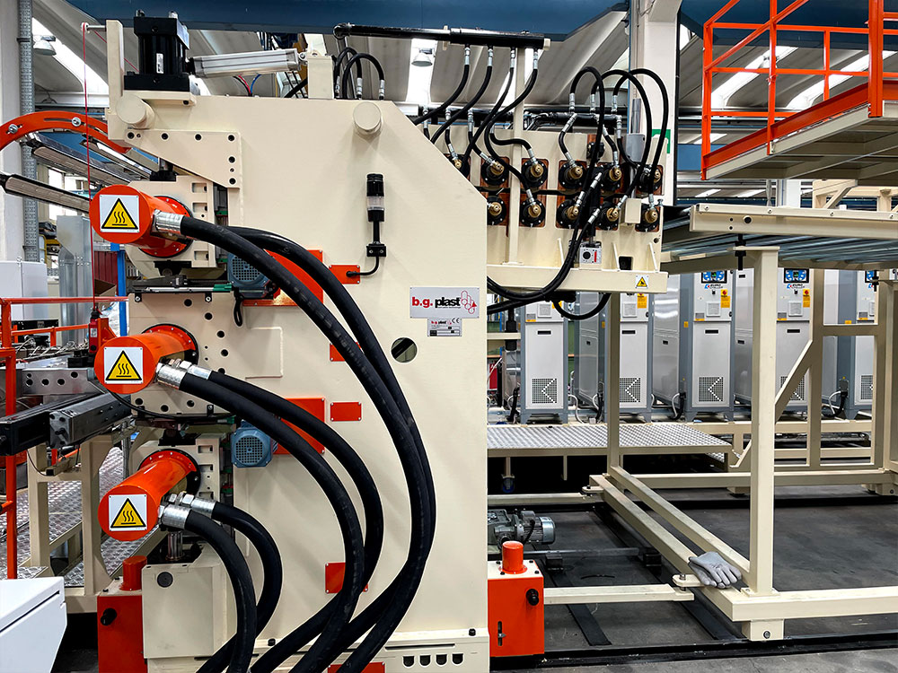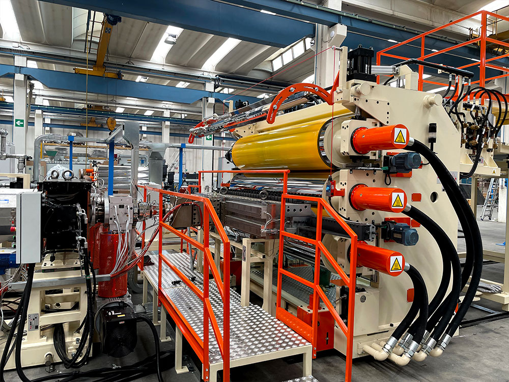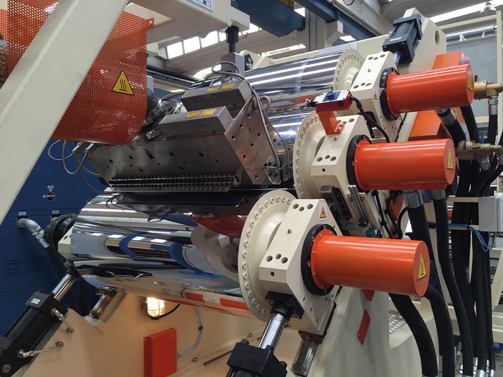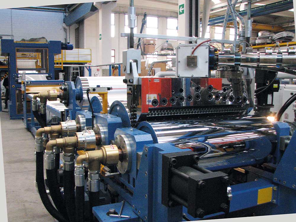 Sizes of BG Plast extrusion lines and calenders vary according to the final product, required by the customer. The width range of calender rolls goes from 450 mm to 8000 mm. Thanks also to the different types of feed-block configurations, BG Plast has faced several co-extrusion applications, using up to 7 extruders.
